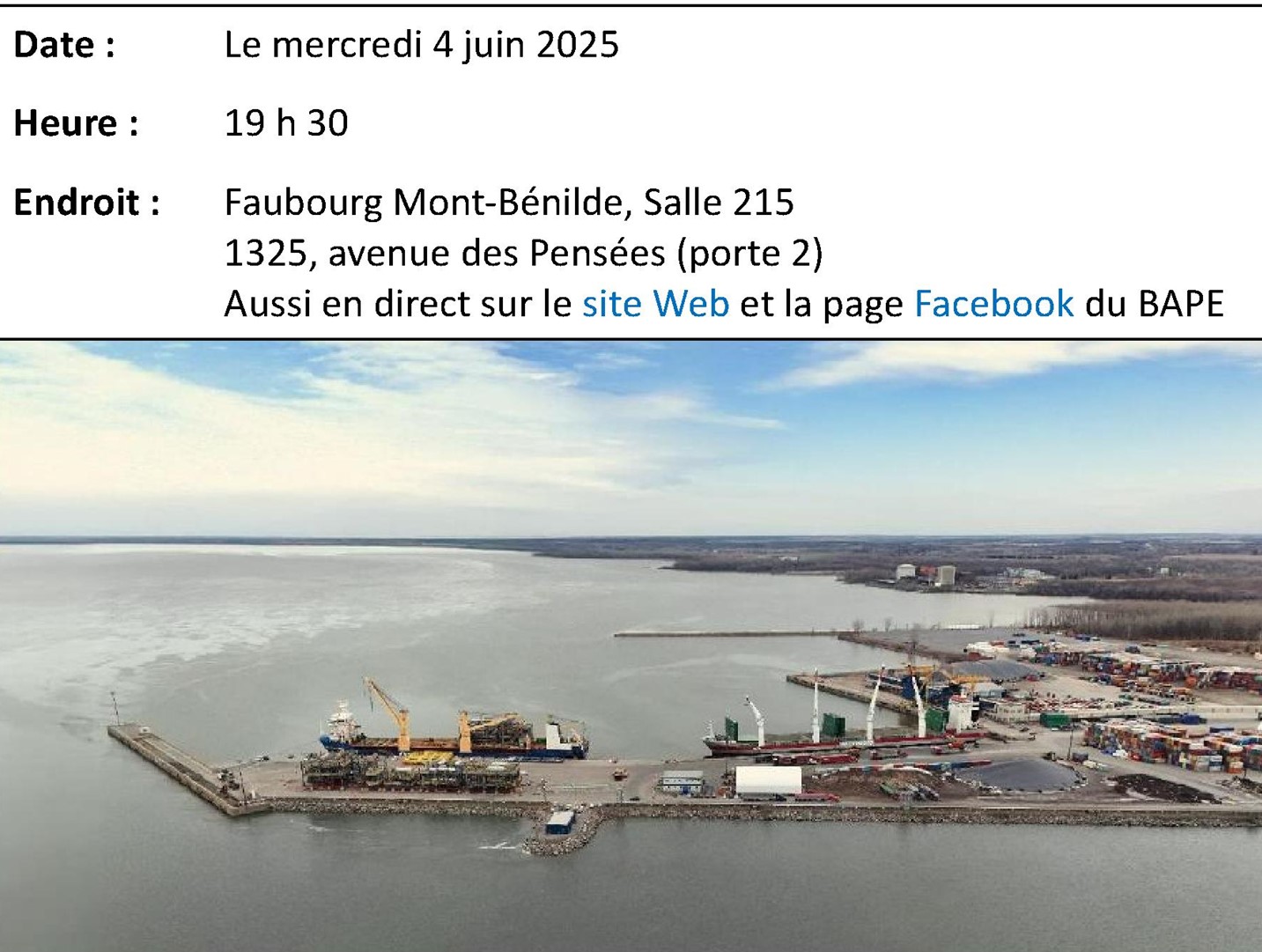Québec, le 21 mai 2025 - Le Bureau d'audiences publiques sur l'environnement (BAPE) annonce le début de la période d'information publique sur le programme décennal de dragage d'entretien des installations portuaires de Bécancour par la Société du parc industriel et portuaire de Bécancour (SPIPB) et invite la population à la séance publique d'information qui se tiendra le mercredi 4 juin à 19 h 30.