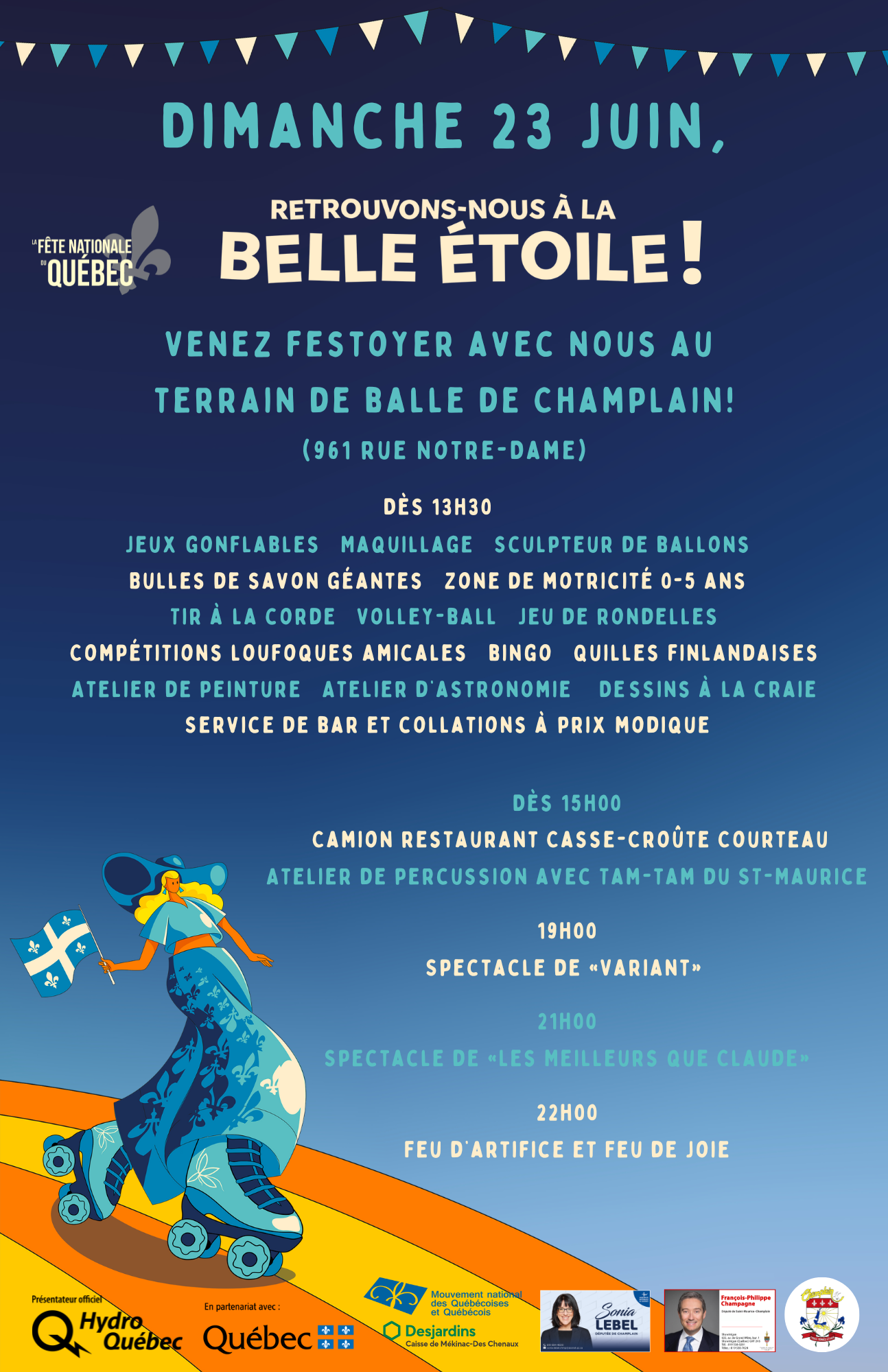 À Champlain, on aime festoyer et la Fête Nationale est une belle occasion de se rassembler. Musique d'ambiance, animation, jeux gonflables, feux d'artifices, nourritures, groupes de musique et plus encore vous sont proposés afin de faire de cette journée une célébration digne de ce nom.